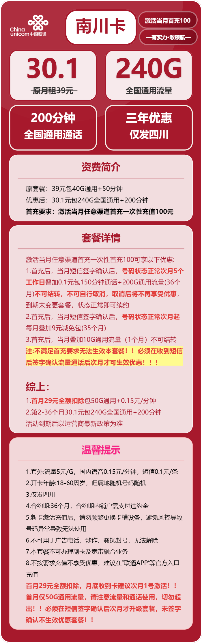 虽然南川卡30.1元240G的套餐是真的,没有套路,但是使用过程中有几个关键细节,小韩聊卡一定要跟大家说清楚,别踩错了,不然可能享受不到优惠。第一个细节,首充100元必须是激活当月一次性充值,分多次充值不行,而且建议在“联通APP”等官方入口充值,非官方入口充值可能会导致优惠无法生效;第二个细节,必须完成短信签字确认,充值后运营商会发送确认短信,大家一定要及时回复确认,没确认的话,就算充了钱也享受不到240G流量+200分钟通话的优惠;第三个细节,首月的资费和流量和优惠期不同,首月是29元全额扣除,包含50G通用流量,通线元/分钟,大家月底收到卡的线号再激活,避免首月流量不够用;第四个细节,这款卡仅发四川,只有四川地区的朋友能办理,开卡年龄要求18-60周岁,归属地和号码都是随机的;第五个细节,合约期36个月,合约期内销户需要支付违约金,办卡前要考虑好使用时长。